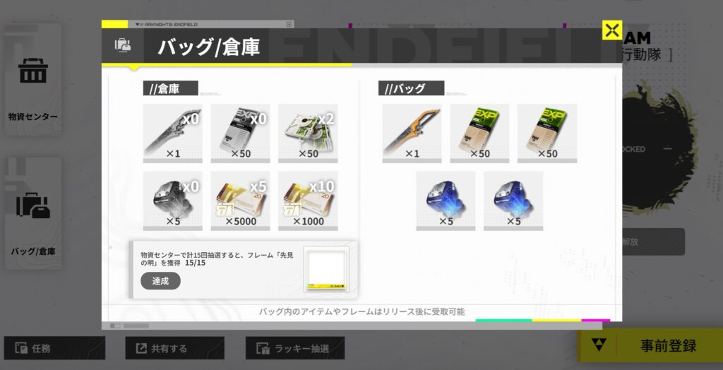 リリース前のイベントとして事前ガチャができたので参加。バッグには★5武器「鋼鉄余韻」は迷わず入れ、後は数の少ないものが比較的貴重だろうと考えて経験値とスキル強化を選択しました。
