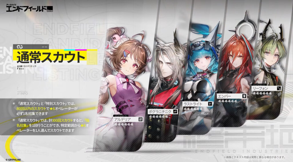 ★6排出率は0.8%で、65回を越えると1回スカウトするごとに5%ずつ排出率が上昇し、80回以内には★6オペレーター1体確定。★6獲得でリセットされ排出率は0.8%に戻り、また65回を越えたら排出率が上昇していく仕組みのようです。