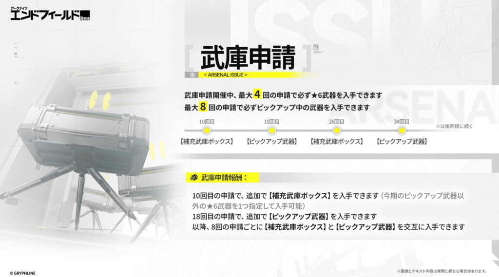申請1回ごとに★5武器確定、40連で★6武器確定(すり抜け率75%)、80連でピックアップ★6武器確定、100連でピックアップ以外の★6を選択して入手可です。